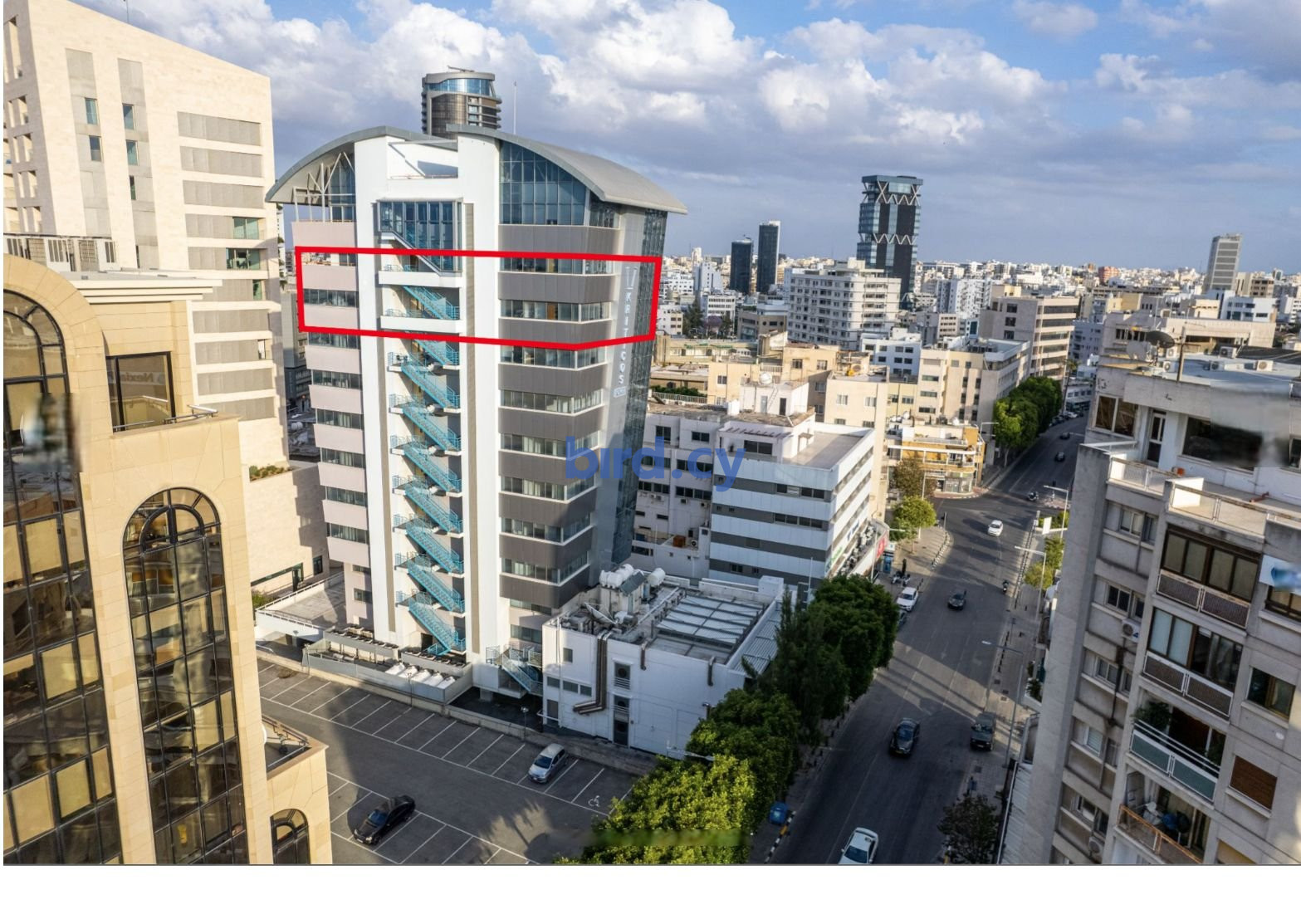 The property concerns two whole floor offices located on the 9th and 10th floors of a mixed-use building in Trypiotis.